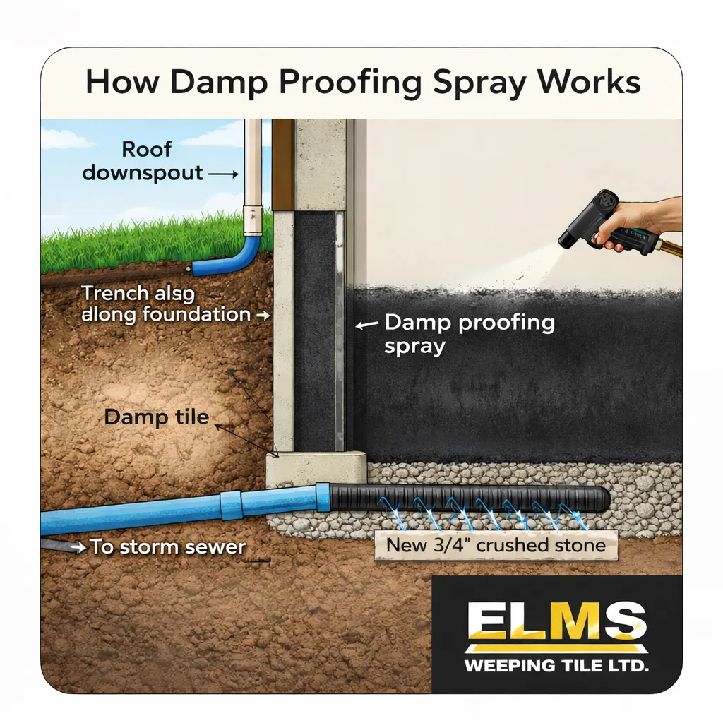 The spray is applied at the appropriate thickness to meet or exceed minimum code requirements, creating a continuous moisture-resistant coating along the foundation wall. When used in conjunction with weeping tile or other drainage systems, damp proofing helps reduce moisture exposure and supports overall foundation performance.